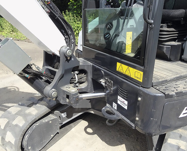 Galerie: Bobcat Minibagger E60 (2/2) > zum Artikel12_21_001_8 weiter >Wie bei Bobcat üblich, liegt der Schwenkzylinder auf der dem Fahrer zugewandten Seite. Der Schwenkbock selbst und die Aufnahme am Rahmen machen einen robusten Eindruck.