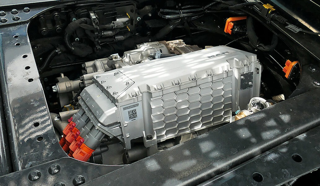 Galerie: Elektro-Trucks von MAN > zum Artikel0925_019_4 < zurück weiter >Von oben gesehen verrät nur der Inverter die darunterliegende E-Motor-/Getriebe-Einheit. (Bild: bd/Domina)