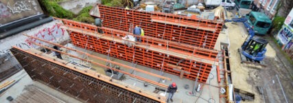 Zum Einsatz kam die Logo.3-Wandschalung: Für das 60 cm hohe Fundament 1 m hohe Schalelemente, die Schalung für die Wände war 5,5 m hoch. Die Fundamentschalfläche war jeweils 80 m² groß, die Wandschalung für die Rahmenbauwerke 300 und 110 m². Hinzu kamen jeweils 70 m² Deckenschalung, bei dem das Traggerüst TG 60 von Paschal genutzt wurde. Und wenn schließlich „das Bauteil eingeschoben wird, steht es auf einem 300 mm hohen Stahlträger. Dann bringen wir durch Rohre den Beton ein, damit das Bauwerk auch satt auf dem Untergrund steht“, erläutert Marc Weißgräber.