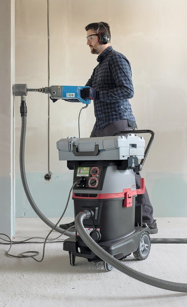 Saugstrom und Saugleistung bleiben auch während der Abreinigung auf konstant hohem Niveau. Das findet automatisch alle 45 Sekunden statt. Die vier Sauger decken die Staubklassen L und M mit Behältervolumen von 35 oder 50 l ab. Die L-Sauger reichen für die Bearbeitung von Kalk oder Gips aus.