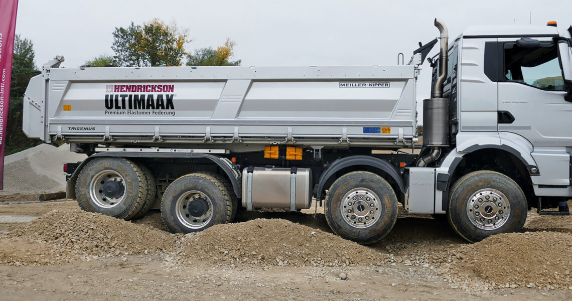 Galerie: Nutzfahrzeug-Trio > zum Artikel weiter >Enorme Verschränkung zeichnet das Hendrickson-Bogie aus. Wegen seiner sanften Selbstlenk-Eigenschaften soll es in Kurvenfahrt die Reifen besonders schonen. (Bild: bd/Domina)