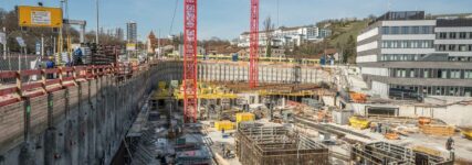 Der Gebäudeentwurf ist auf größtmögliche Flexibilität ausgerichtet. Dem entsprechen auch die maximal zulässigen Traglasten: Sie liegen im Erdgeschoss bei 5 t/m² und im Obergeschoss bei 1 t/m². Um die Ortbetonwände des Untergeschosses zu errichten, entschied man sich bei Implenia Hochbau für Noe-Schalung: Zum Einsatz kam die Wandschalung Noe-Top, die leichte Schalung Noe-Alu L und der Stützenturm Noe-Prop. Letztere nutzte das Implenia-Baustellenteam, um Höhen bis 7,8 m in den Deckenbereichen sicher zu stützen.