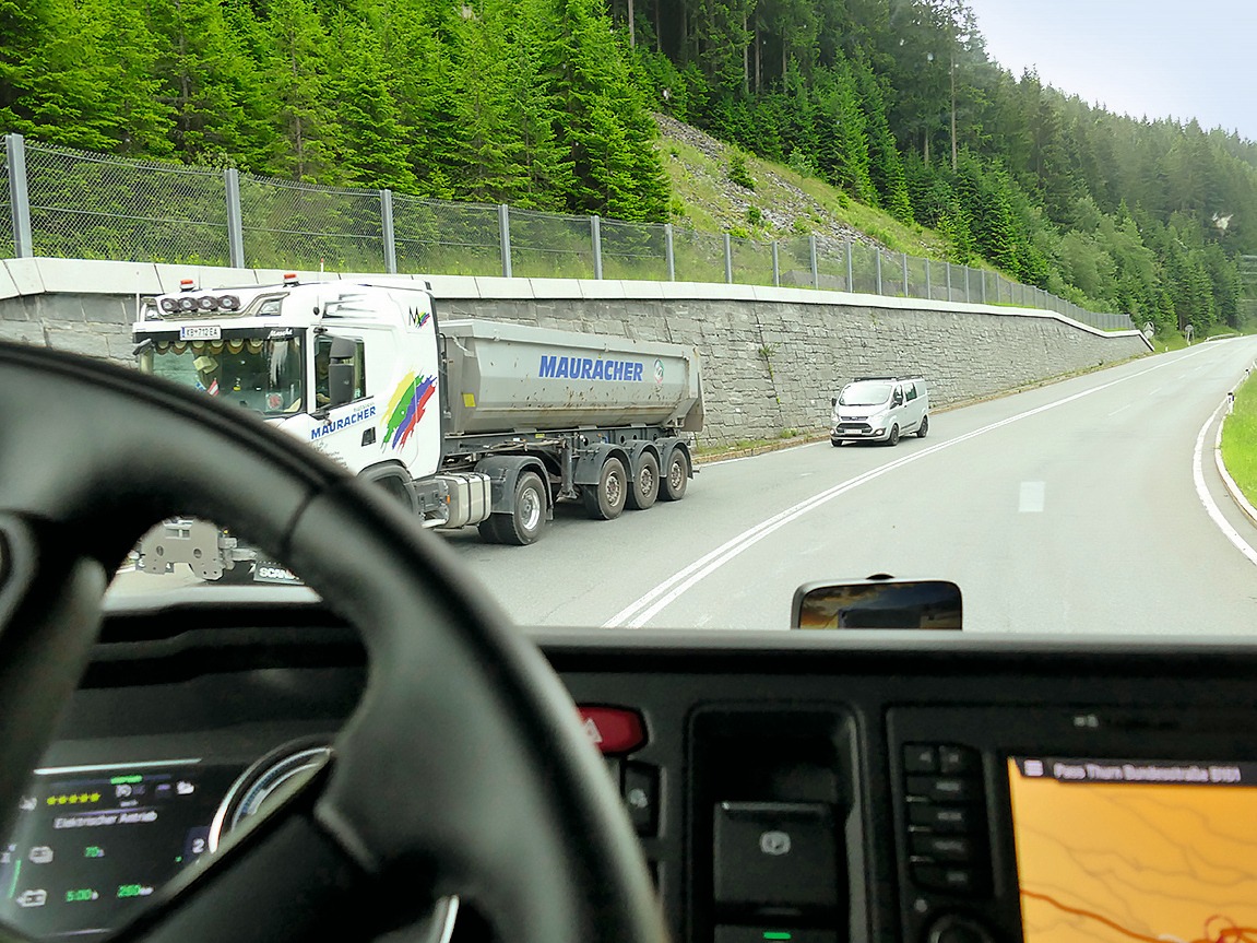 Mir scheint, ich habe hier mehr Spaß am Bremsen als beim Spiel mit dem Gaspedal den Pass hinauf. Das ist in der Tat ungewöhnlich, reizt bergaufheizen doch eher die Sinne – mit Gas rein, Gas raus, schalten (lassen) und feiner Lenkarbeit. Aber dieser 26 t schwere Scania 6×2 40 R lässt seine Masse gnadenlos walten. Zum Glück haben die Scania-Techniker es geschafft, die bekannte Retarder-Funktion vom Verbrenner eins zu eins zu übernehmen. Sowohl was die Abstufung betrifft, als auch die Bedienung: Die läuft, wie beim Verbrenner, über den wohlbekannten rechten Lenkstockhebel und seine fünf Rasten. Die ersten beiden Stufen leiten allenfalls eine sanfte Verzögerung ein, um vielleicht hier und da die Geschwindigkeit auf der Ebene anzupassen.