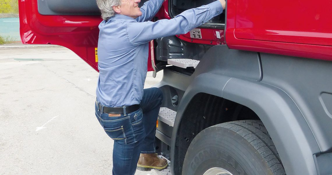 Galerie: Scania R 450 4×2-Bausattel 1 > zum ArtikelScania R 450 4x2-Bausattel Aufstieg < zurück weiter >Die unterste Stufe ist fest, sitzt aber hoch, treppenartig eingezogener Aufstieg. 385/65er-Breitreifen vorn sind gut gegen Einsinken, der Verbrauch aber erhöht sich dadurch. (Bild: bd/Domina)
