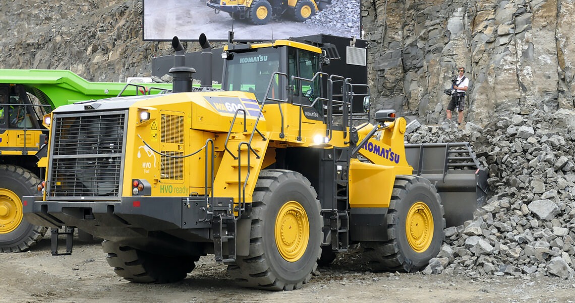 Komatsu hat seinen bewährten Radlader WA 600-8 (55 t Betriebsgewicht) ins Rennen geschickt. Beladen wird hier ein Starr-Rahmen-Muldenkipper HD 605-8 mit einer Besonderheit: Die Mulde vom australischen Zulieferer Duratray hat einen Boden aus Gummi, was die Lärmentwicklung beim Beladen deutlich reduziert.