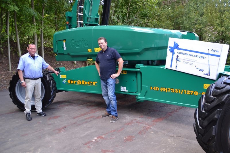 Mit 57 m Arbeitshöhe und einer horizontalen Reichweite bis 24,4 m hat Genie ein ganz besonderes Modell seiner Teleskoparbeitsbühne SX-180 bei den Platformers‘ Days im hessischen Hohenroda an Gräber Arbeitsbühnen übergeben. Das Großgerät für den Vermieter mit Stammsitz in Konstanz sowie Niederlassungen in Donaueschingen und Weingarten glänzt in der Firmenfarbe türkisgrün. Für Inhaber Alexander Gräber kaufentscheidend sind "die gute Transportfähigkeit durch besonders schmale Maschinenabmessungen in Transportstellung in Kombination mit dem relativ geringen Gewicht von 24.948 kg." Die Achsen lassen sich in rund einer Minute aus- und wieder einfahren, was zudem eine solide Standfestigkeit garantiert. Für hohe Präzision sorgen die proportionale Steuerung, ein Plattformschwenkbereich von 160° sowie ein 360° kontinuierlich drehbarer Oberwagen. Darüber hinaus verfügt dieses Modell über einen 3,05 m langen schwenkbaren Korbarm, der 285,5 m³ Arbeitsbereich abdeckt, indem er sich 135° vertikal sowie 60° horizontal positionieren lässt.